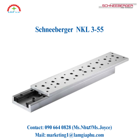 Bàn trượt không ma sát Schneeberger NKL 3-55 gồm phần trên và phần dưới có chiều dài bằng nhau và ổ tuyến tính loại R. Tất cả đều trang bị lồng con lăn loại AC và đầu chặn loại GB, có thể lắp theo phương đứng hoặc nằm ngang. Ở phần trên và phần dưới đều có các lỗ bắt tiêu chuẩn; các mặt đối diện với vít chỉnh ở phần trên và dưới có thể dùng để gá lắp.