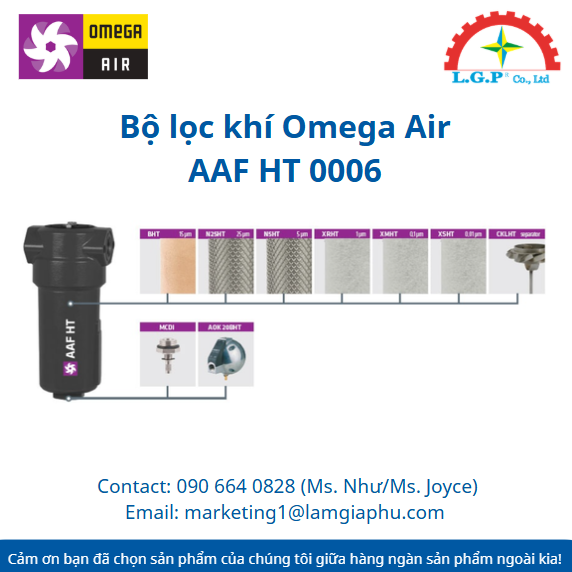 Bộ lọc khí Omega Air AAFHT0006 là sản phẩm thuộc Bộ lọc khí nén chịu nhiệt độ cao Omega Air dòng AAF HT, là bộ lọc khí nén bằng nhôm được thiết kế chuyên biệt để hoạt động trong các môi trường có nhiệt độ cao. Sản phẩm có khả năng loại bỏ cực kỳ hiệu quả các hạt rắn, hơi nước và sol khí dầu (oil aerosols) trong hệ thống khí nén. Để đạt được chất lượng khí nén mong muốn, thân bộ lọc cần được lắp đặt kèm các lõi lọc chịu nhiệt tương ứng như BHT, N25HT, N5HT, XRHT, XMHT, XSHT, tùy thuộc vào cấp độ lọc yêu cầu.