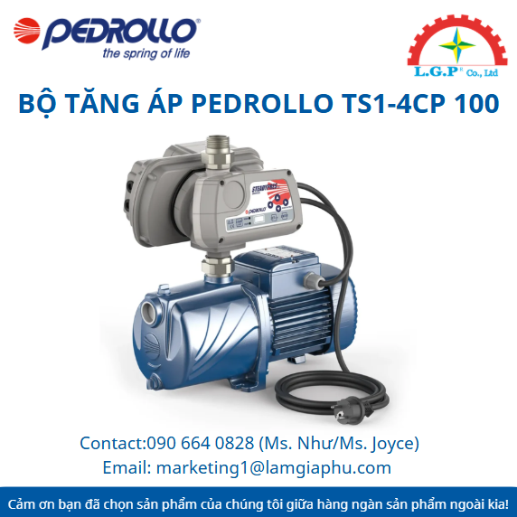 LGP Co., Ltd– Chúng tôi cung cấp Bộ tăng áp Pedrollo TS1-4CP 100, nổi tiếng về chất lượng và hiệu suất vượt trội trên thị trường. Sản phẩm của chúng tôi được khách hàng đánh giá cao về độ tin cậy và chất lượng tiêu chuẩn. Các sản phẩm được kiểm tra cẩn thận, mua từ các nguồn uy tín và có nhu cầu cao. Chúng tôi cung cấp trên toàn quốc với giá cả cạnh tranh. Ngoài ra, chúng tôi còn cung cấp các sản phẩm của các thương hiệu như Silvent, Vikan, Air Torque, Jumo, Yudian,…