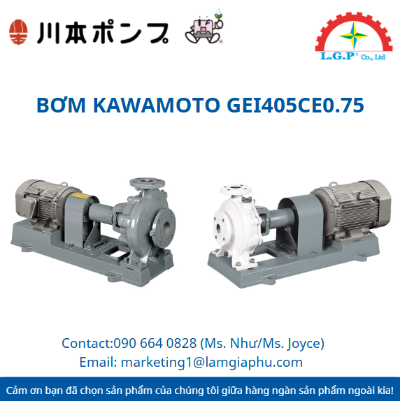 LGP Co., Ltd– Chúng tôi cung cấp Bơm Kawamoto GEI405CE0.75, nổi tiếng về chất lượng và hiệu suất vượt trội trên thị trường. Sản phẩm của chúng tôi được khách hàng đánh giá cao về độ tin cậy và chất lượng tiêu chuẩn. Các sản phẩm được kiểm tra cẩn thận, mua từ các nguồn uy tín và có nhu cầu cao. Chúng tôi cung cấp trên toàn quốc với giá cả cạnh tranh. Ngoài ra, chúng tôi còn cung cấp các sản phẩm của các thương hiệu như Silvent, Vikan, Air Torque, Jumo, Yudian,…