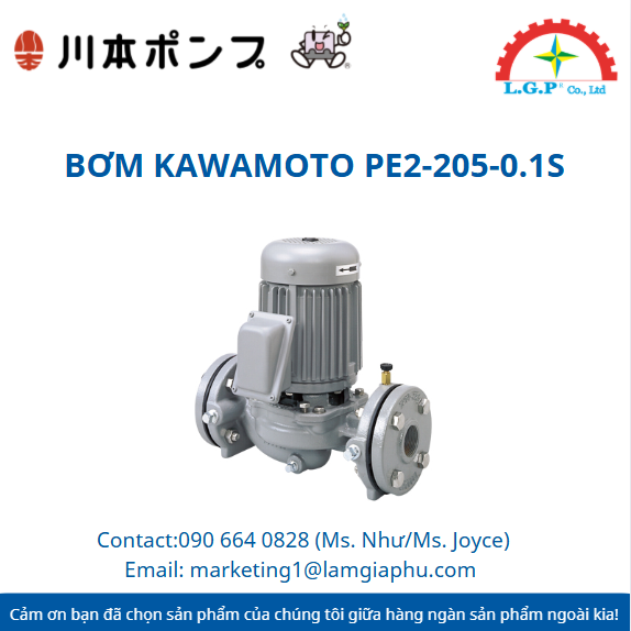 Bơm Kawamoto PE2-205-0.1S siêu bền với động cơ kín hoàn toàn và phớt chống ăn mòn, chuyên dùng tuần hoàn nước nóng lạnh, máy móc và các ứng dụng công nghiệp.