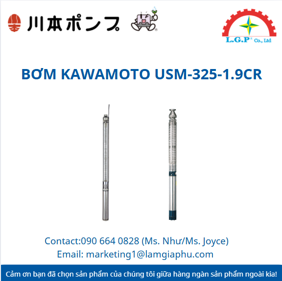 LGP Co., Ltd– Chúng tôi cung cấp Bơm Kawamoto USM-325-1.9CR, nổi tiếng về chất lượng và hiệu suất vượt trội trên thị trường. Sản phẩm của chúng tôi được khách hàng đánh giá cao về độ tin cậy và chất lượng tiêu chuẩn. Các sản phẩm được kiểm tra cẩn thận, mua từ các nguồn uy tín và có nhu cầu cao. Chúng tôi cung cấp trên toàn quốc với giá cả cạnh tranh. Ngoài ra, chúng tôi còn cung cấp các sản phẩm của các thương hiệu như Silvent, Vikan, Air Torque, Jumo, Yudian,…