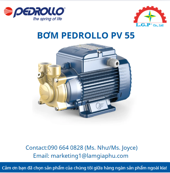 Bơm Pedrollo PV 55: Bơm ly tâm thân đồng chống gỉ sét và oxy hóa, chuyên dùng cho nước sạch và các hệ thống công nghiệp. Thiết kế nhỏ gọn, bền bỉ, đặc biệt hiệu quả trong hệ thống làm mát và điều hòa không khí.