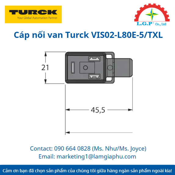 Cáp nối van Turck VIS02-L80E-5/TXL (5m) chuẩn BI 2-pin+PE, vỏ PUR chịu dầu và đạt chuẩn IP68. Sản phẩm thiết kế theo tiêu chuẩn DIN EN 175301-803, hiện được Lâm Gia Phú cung cấp chính hãng cho các hệ thống van điện từ.