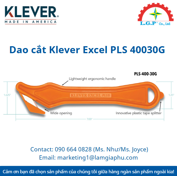 Dao cắt Klever Excel PLS 40030G là phiên bản cải tiến, tập trung vào an toàn và công thái học, được thiết kế để giảm thiểu tối đa sự mệt mỏi cho tay và cánh tay người dùng (giảm lực kéo). Sản phẩm có lưỡi ẩn, đảm bảo mức độ an toàn cao nhất và khả năng cắt đa năng (thùng, màng bọc, băng keo). Excel PLS sử dụng lưỡi thép carbon chất lượng cao, rộng và có hướng dẫn cắt chính xác (Precision cut guide), mang lại những đường cắt mượt mà, dễ dàng hơn. Sản phẩm là loại dùng một lần (Disposable) và được chế tạo từ Polymer nhựa tiên tiến.