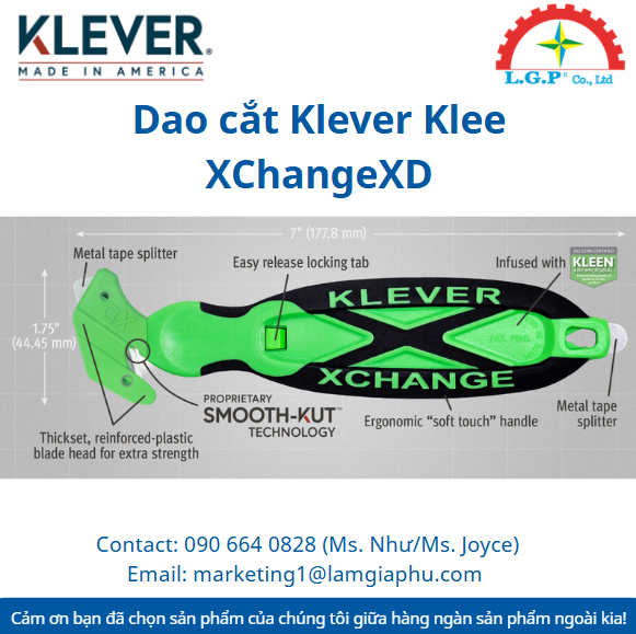 Dao cắt Klever Klee XChangeXD là dao cắt an toàn lưỡi ẩn CỰC KỲ BỀN BỈ (Made in USA), được tích hợp vật liệu KLEEN™ kháng khuẩn vào thân dao tái sử dụng ‘soft touch’, lý tưởng cho môi trường đề cao vệ sinh. Đầu lưỡi XD của dao MẠNH HƠN 50% và BỀN GẤP 4 LẦN cùng công nghệ Smooth-Kut™ giúp cắt nhanh, trơn tru. Sản phẩm giúp tối ưu chi phí và giảm rác thải nhựa nhờ thiết kế thay thế đầu lưỡi.
