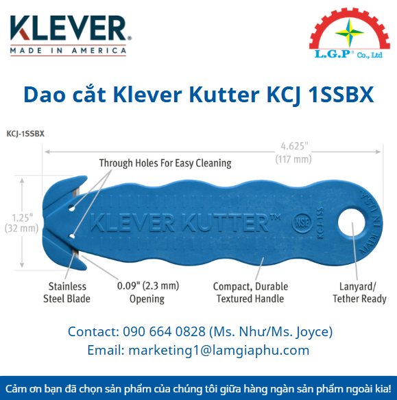Dao cắt Klever Kutter KCJ 1SSBX an toàn với lưỡi ẩn, NSF Food Zone Certified, lý tưởng cho ngành thực phẩm. Tích hợp KLEEN™ Kháng Khuẩn và tuân thủ màu sắc HACCP (Màu Xanh Dương) để chống lây nhiễm chéo. Cấu tạo từ nhựa FDA bền bỉ, lưỡi thép không gỉ, an toàn tối đa và có thể vệ sinh bằng máy rửa chén/nồi hấp, sản xuất tại Hoa Kỳ.
