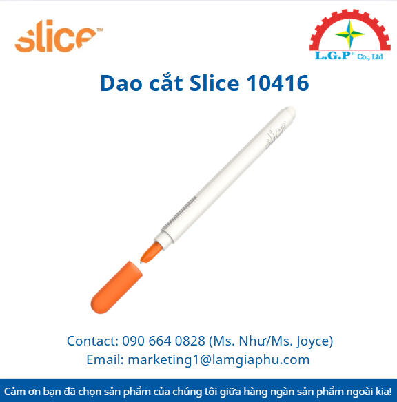 Dao cắt Slice 10416 tên đầy đủ là Dao Cắt Tinh Xảo/Chính Xác Slice 10416 công cụ lý tưởng cho các công việc chi tiết, phức tạp đòi hỏi độ chính xác và sự thoải mái khi sử dụng. Dao có thiết kế quen thuộc hình cây bút với tay cầm có vân (textured grip) giúp dễ dàng kiểm soát. Lưỡi micro-blade finger-friendly® độc quyền được bảo vệ trong hộp thay thế, đảm bảo cắt an toàn và chính xác. Thân dao làm từ nylon gia cố bền bỉ và đi kèm nắp bảo vệ, phù hợp cho cả người dùng thuận tay trái và phải.