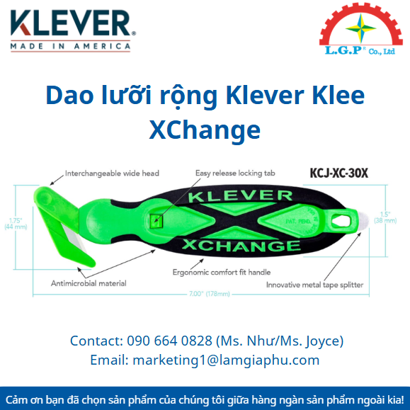 Dao lưỡi rộng Klever Klee XChange (30) là dao cắt an toàn lưỡi ẩn, sử dụng lưỡi thép carbon chất lượng cao. Sản phẩm có tùy chọn thân dao gắn lưỡi (144 chiếc/thùng) và đầu lưỡi thay thế (500 chiếc/thùng). Thiết kế Kleen™ kháng khuẩn và khả năng thay đầu lưỡi giúp tối ưu vệ sinh và chi phí.