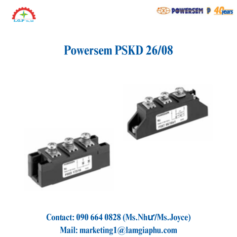Powersem PSKD 26/08 là diode module công suất đóng gói công nghiệp kiểu bắt vít, đế cách điện, chuyên dùng cho các khối chỉnh lưu AC/DC và tạo DC bus trong biến tần, UPS, SMPS và truyền động công nghiệp. Thiết kế cơ khí chắc chắn, dễ lắp tản nhiệt, chịu xung tốt và tổn hao thấp giúp vận hành ổn định, bền bỉ trong môi trường làm việc liên tục.
