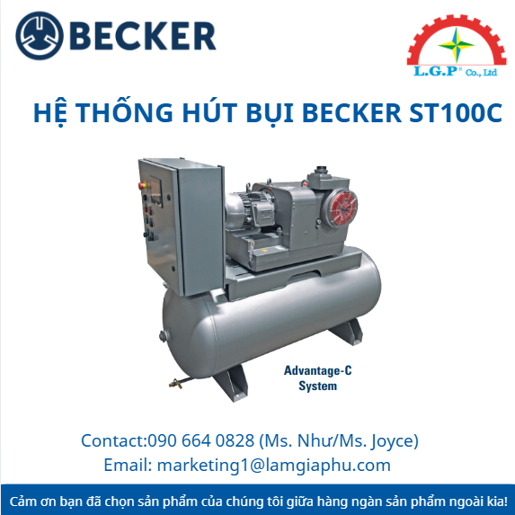 Hệ thống hút bụi Becker ST100C là giải pháp thu gom bụi công nghiệp hiệu suất cao, sử dụng công nghệ bơm chân không mỏ vịt vận hành khô, không dầu. Thiết bị chuyên dụng cho các dây chuyền sản xuất gỗ, bao bì, nhựa và cơ khí chính xác.
