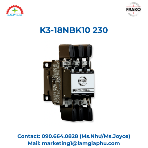 Khởi động từ Frako K3-18NBK10 230 là contactor tụ bù 3 pha 18A, cuộn hút 230V, dùng cho hệ thống có cuộn kháng. Tiếp điểm đặc biệt, đóng cắt ổn định, phù hợp bộ lọc sóng hài.