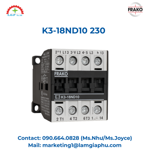 LGP Co., Ltd – Chúng tôi cung cấp Khởi động tự đóng cắt tụ bù Frako K3-18ND10 230, nổi tiếng về chất lượng và hiệu suất vượt trội trên thị trường. Sản phẩm của chúng tôi được khách hàng đánh giá cao về độ tin cậy và chất lượng tiêu chuẩn. Các sản phẩm được kiểm tra cẩn thận, mua từ các nguồn uy tín và có nhu cầu cao. Chúng tôi cung cấp trên toàn quốc với giá cả cạnh tranh. Ngoài ra, chúng tôi còn cung cấp các sản phẩm của các thương hiệu như Silvent, Vikan, Air Torque, Jumo, Yudian,…