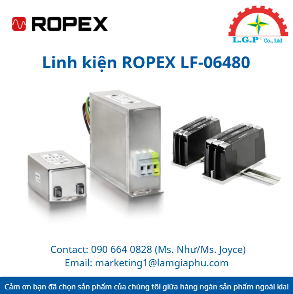 Linh kiện ROPEX LF-06480 là sản phẩm thuộc Bộ lọc nhiễu ROPEX (một trong các bộ sản phẩm trong Bộ linh kiện hệ thống ROPEX), là thành phần bắt buộc cho tất cả các bộ điều khiển nhiệt độ ROPEX để đáp ứng các chỉ thị EMC và đảm bảo tính hợp chuẩn CE. Thiết bị đóng vai trò làm giảm phản ứng của điều khiển pha trên dòng điện, đồng thời bảo vệ bộ điều khiển khỏi các nhiễu loạn từ lưới điện.