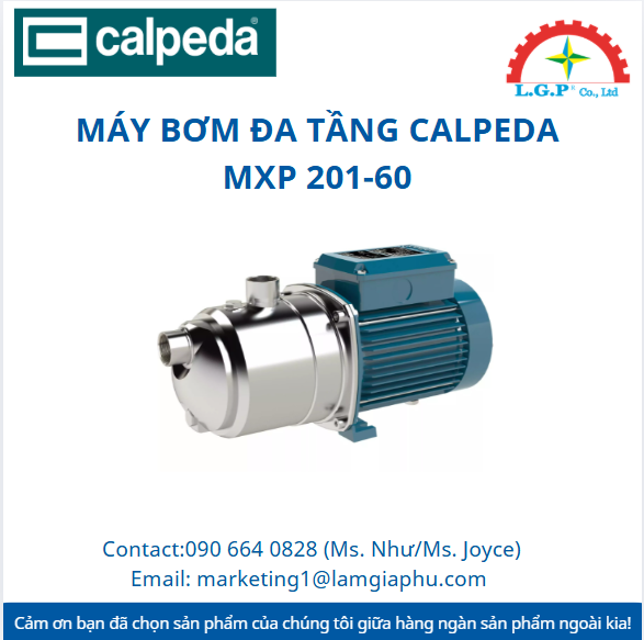 LGP Co., Ltd– Chúng tôi cung cấp Máy bơm đa tầng Calpeda MXP 201-60, nổi tiếng về chất lượng và hiệu suất vượt trội trên thị trường. Sản phẩm của chúng tôi được khách hàng đánh giá cao về độ tin cậy và chất lượng tiêu chuẩn. Các sản phẩm được kiểm tra cẩn thận, mua từ các nguồn uy tín và có nhu cầu cao. Chúng tôi cung cấp trên toàn quốc với giá cả cạnh tranh. Ngoài ra, chúng tôi còn cung cấp các sản phẩm của các thương hiệu như Silvent, Vikan, Air Torque, Jumo, Yudian,…