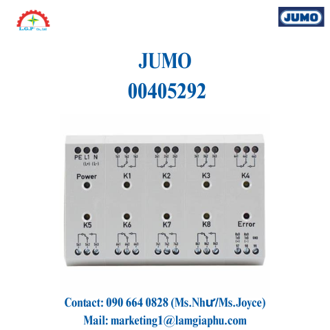 Mô-đun rơ le Jumo 00405292 bên ngoài có dải cung cấp điện áp từ AC 110 đến 240 V và được chế tạo để gắn đường ray DIN. Với mô-đun bên ngoài này, tám rơle có thể được thêm vào các thiết bị đặc biệt. Việc điều khiển diễn ra tại giao diện RS422 / RS485.