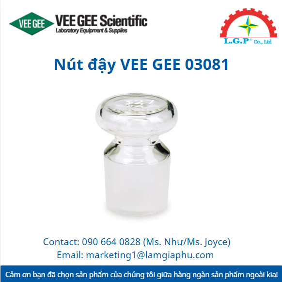 Nút đậy VEE GEE 03081 là nút thủy tinh côn tiêu chuẩn (Standard Taper) đạt ASTM E-675. Sản phẩm nhẹ nhưng chắc chắn, có thiết kế mặt trên phẳng giúp nút tự đứng vững, ngăn ngừa nhiễm bẩn, và hoàn toàn tương thích với các dụng cụ thủy tinh khác.