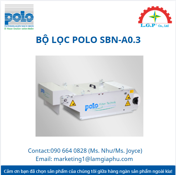 LGP Co., Ltd– Chúng tôi cung cấp POLO SBN-A0.3| Bộ lọc POLO SBN-A0.3, nổi tiếng về chất lượng và hiệu suất vượt trội trên thị trường. Sản phẩm của chúng tôi được khách hàng đánh giá cao về độ tin cậy và chất lượng tiêu chuẩn. Các sản phẩm được kiểm tra cẩn thận, mua từ các nguồn uy tín và có nhu cầu cao. Chúng tôi cung cấp trên toàn quốc với giá cả cạnh tranh. Ngoài ra, chúng tôi còn cung cấp các sản phẩm của các thương hiệu như Silvent, Vikan, Air Torque, Jumo, Yudian,…