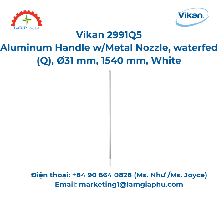 Item number: Vikan 2991Q5 – Aluminum Handle w/Metal Nozzle, waterfed (Q), Ø31 mm, 1540 mm, White