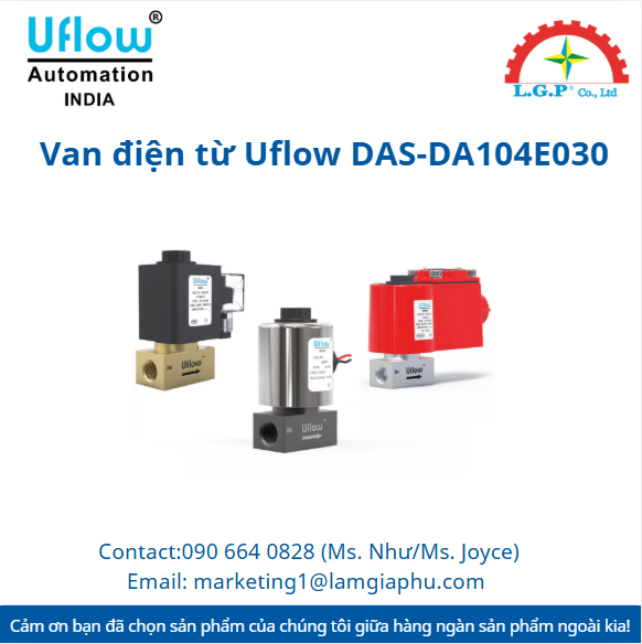 Van điện từ Uflow DAS-DA104E030 hiệu suất cao, bền bỉ, chống ăn mòn. Kiểm soát chính xác khí, nước, dầu, hoạt động êm, tiết kiệm năng lượng. Dễ lắp đặt, vận hành ổn định, phù hợp công nghiệp, thực phẩm, dược phẩm và môi trường ngoài trời.