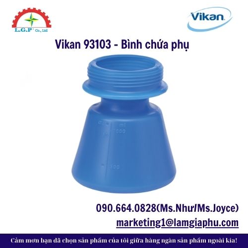 Vikan 93103 là bình chứa phụ 1.4 lít, làm từ Polyethylene (HDPE) màu xanh lam, thiết kế để sử dụng với súng phun bọt Vikan 9301x và 9305x. Bình tuân thủ các quy định REACH, Halal và Kosher, nhưng không đáp ứng các yêu cầu về vật liệu tiếp xúc với thực phẩm theo EC 1935/2004, FDA CFR 21 và UK 2019 No. 704. Bình chịu được nhiệt độ từ 5°C đến 60°C và có thể sử dụng trong phạm vi pH từ 2 đến 11.