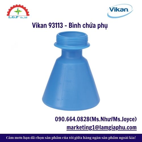 Vikan 93113 là bình chứa phụ 2.5 lít, làm từ Polyethylene (HDPE) màu xanh lam, thiết kế để sử dụng với súng phun bọt Vikan 9301x và 9305x. Bình tuân thủ các quy định REACH, Halal và Kosher, nhưng không đáp ứng các yêu cầu về vật liệu tiếp xúc với thực phẩm theo EC 1935/2004, FDA CFR 21 và UK 2019 No. 704. Bình có thể chịu được nhiệt độ từ 5°C đến 60°C và phạm vi pH từ 2 đến 11.